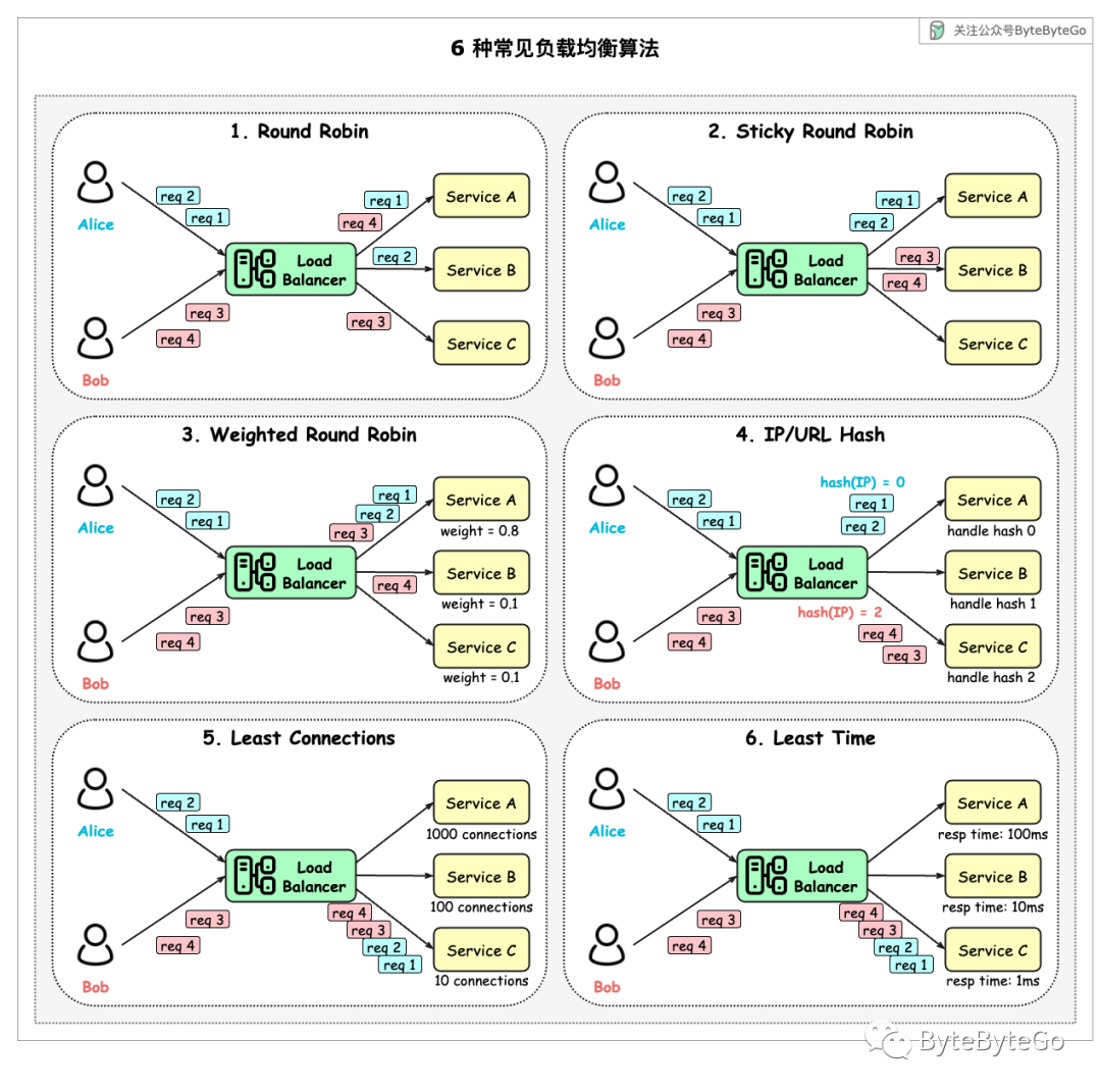 这是对循环算法的一种改进。如果 Alice 的第一个请求发送到服务 A,那么接下来的请求也会发送到服务 A。这种负载均衡可以确保一个用户的请求都发往同一个服务节点,适合客户端操作有连续性的情况。有时候该服务节点上会保存该用户的一些状态,避免去后端数据库查询。