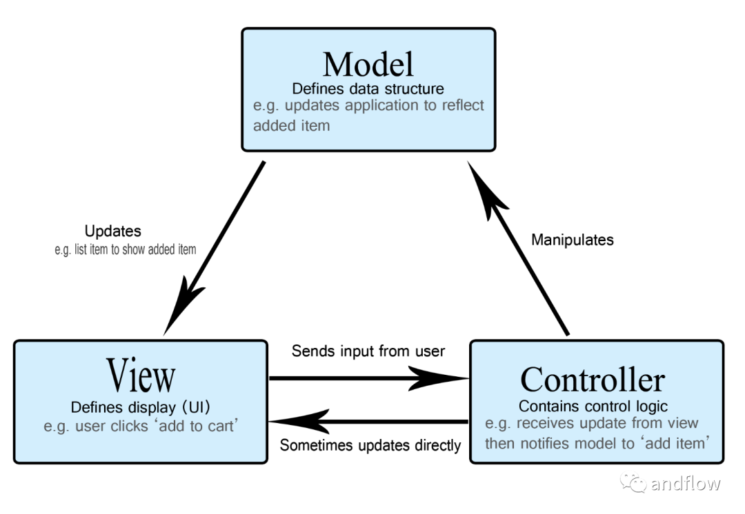 但MVP与MVC有着一个重大的区别在于MVP中视图中不包含任何逻辑,只是作为应用程序的外观,Presenter充当模型和视图之间的中间人。MVP中的View并不直接使用Model,它们之间的通信是通过Presenter(MVC中的Controller)来进行的,所有的交互都发生在Presenter内部,而在MVC中View会直接从Model中读取数据而不是通过Controller。