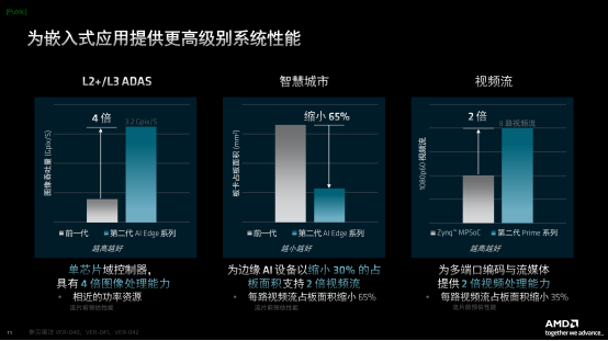 为了满足边缘终端不同阶段的计算需求,AMD推出了面向AI驱动型嵌入系统的第二代Versal AI Edge系列产品和面向经典嵌入式系统的第二代Versal Prime系列产品,不仅提供了更高的AI计算性能,而且更好地降低了功耗,更好地满足AI时代下的企业自适应计算需求。