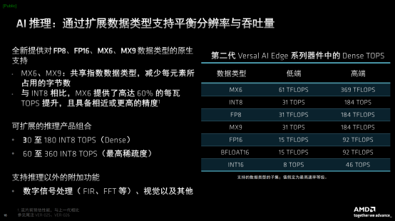 在AI推理过程,第二代Versal AI Edge系列SoC在Dense情况下, MX6数据类型最高可以达到369 TFLOPS,INT8数据类型最高可以达到184 TOPS。如果采用稀疏度计算方式,性能能够实现翻倍。在采用AIE-ML v2情况下,第二Versal AI Edge系列SoC还能够进行一些数据信号的处理,例如FIR、FFT等等。