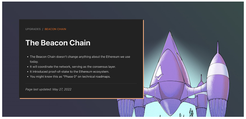 一直以来,以太坊都是基于PoW的。直到2020年12月,其区块链创建了基于??PoS“灯塔链??(Beacon Chain)”。下图是灯塔链的简单介绍。我们可以简单地将基于工作量证明的以太坊称为Ethereum 1.0,而将基于权益证明的版本称为Ethereum 2.0。