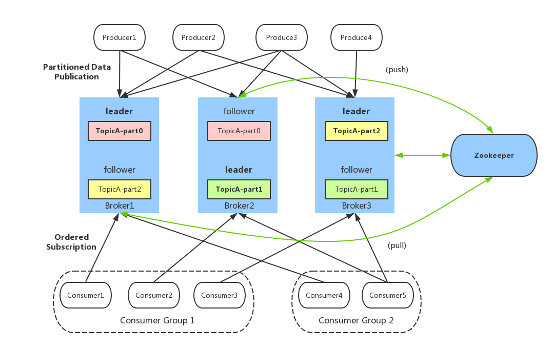 - Topic 注册:在 Kafka 中,同一个 Topic 的消息会被分成多个分区并将其分布在多个 Broker 上,这些分区信息及与 Broker 的对应关系也都是由 Zookeeper 在维护。
