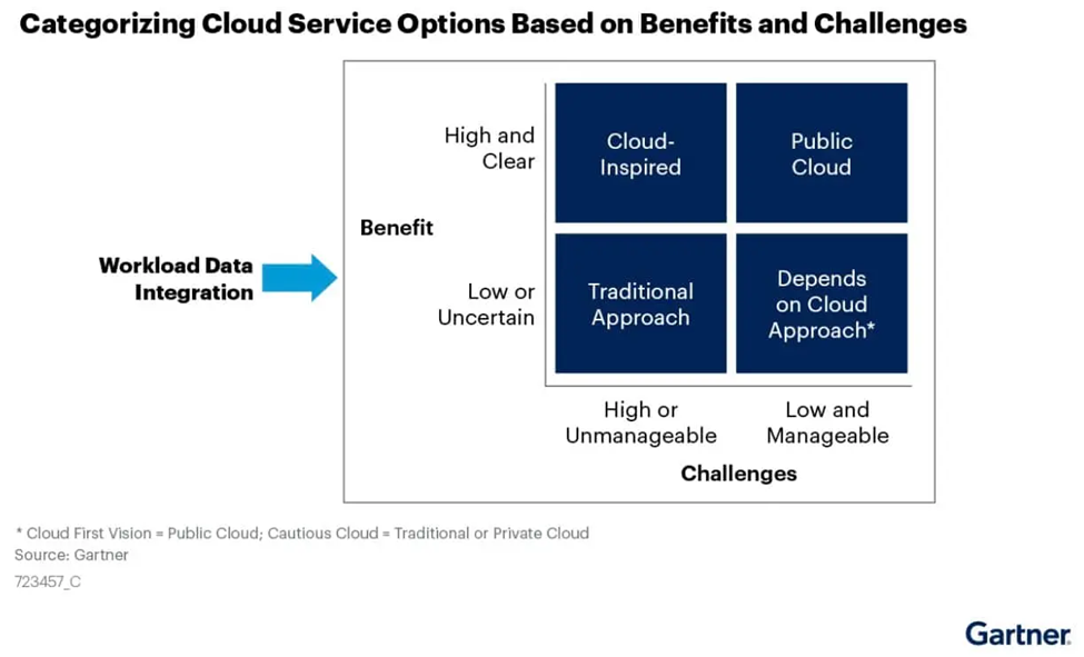 “挑战-效益分析”这一概念乍听上去这像是对已经经过验证的成本收益分析方法的一种扭曲,但 Gartner 通过一个矩阵将选项分为了四类,并根据每个选项在收益轴和风险轴上的位置进行定义。这一矩阵侧重于大多数云采用的主要因素:工作负载数据的集成及其与其他应用程序组件的交互方式(如图)。