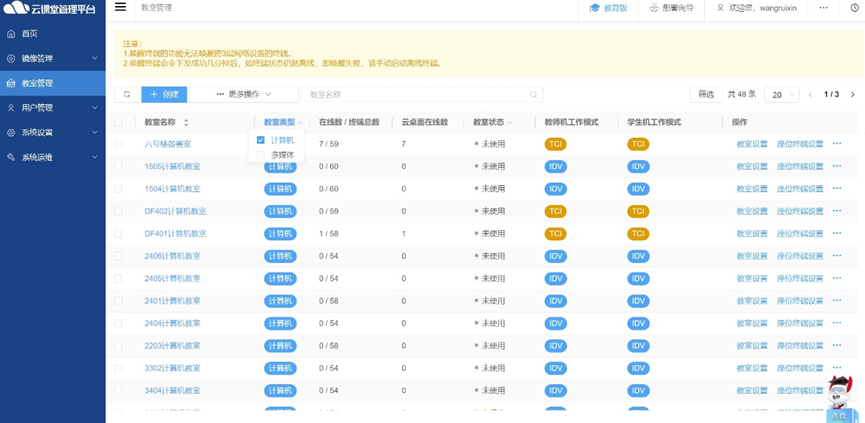 据程主任介绍,学校共有80间计算机教室,其中有12间为3D高性能PC机房,25间为锐捷桌面云机房,其余43间为PC机房。这些计算机教室承载着计算机应用技术、广告艺术设计等专业学生的上课实操和上机考试任务。然而,在原有PC机房的使用过程中,学校逐渐发现了三大痛点问题,严重影响信息部门的运维管理效率。