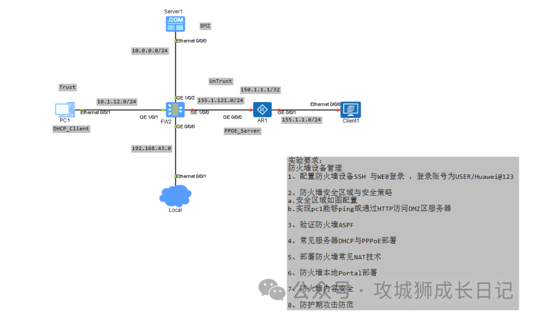 今天接着上一节的实验拓扑图,继续完成今天的任务:防火墙安全区域与安全策略,实验拓扑如下图: