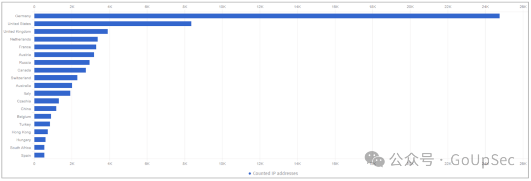 受影响最严重的国家是德国(22,903例)、美国(19,434例)、英国(3,665例)、法国(3,074例)、奥地利(2,987例)、俄罗斯(2,771例)、加拿大(2,554例)和瑞士(2,119例),中国也有超过1000台服务器在线暴露。
