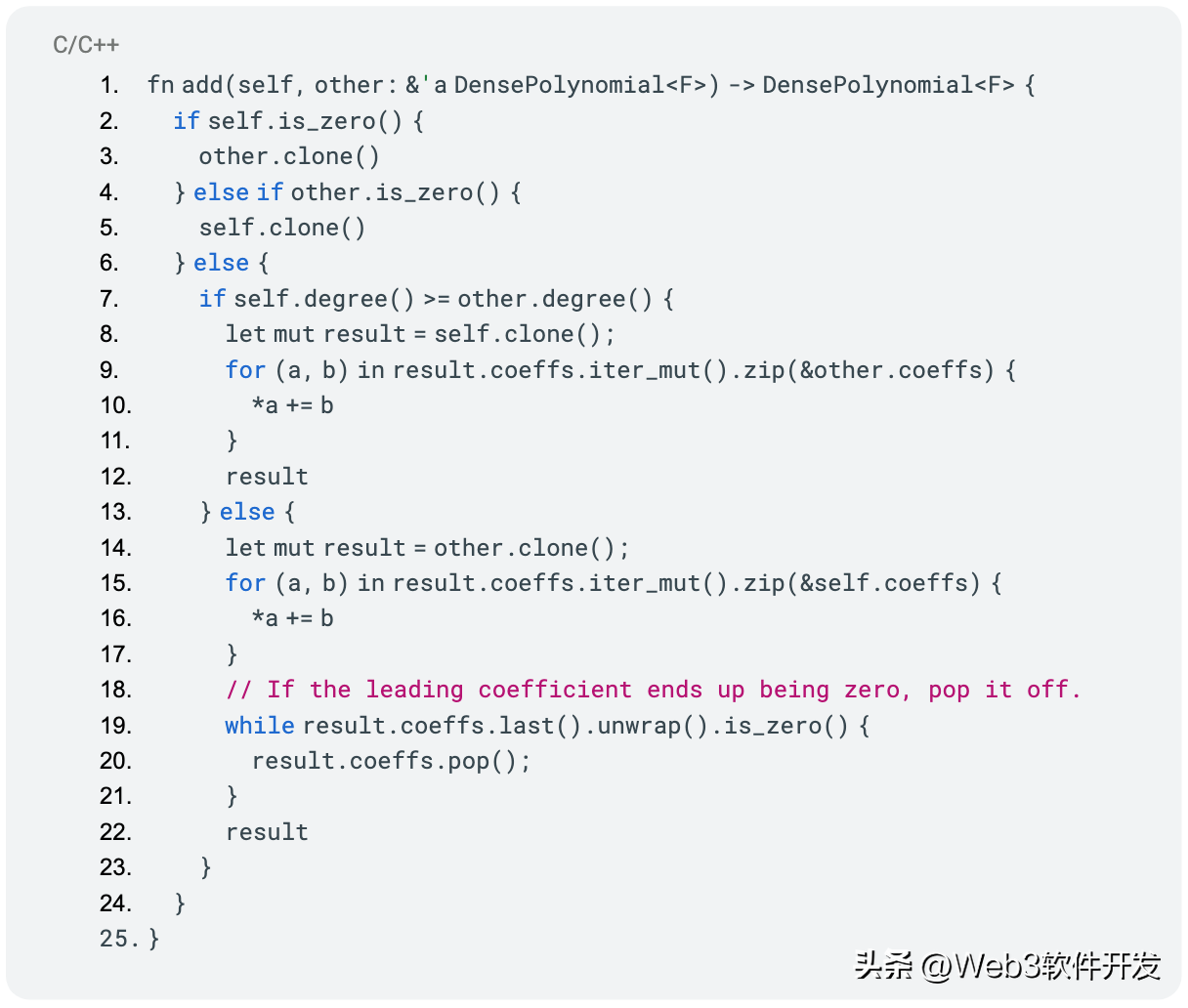 举个例子,self 是非标准化的多项式 1+2x+0x2,即向量[1,2,0],其最高次项的系数为 0。当 other 也不是零多项式时,满足 add() 函数的第三个分支,以 self 来调用 degree() 函数。在 degree() 函数中进入 else 分支。在 else 分支中有一个 assert! 宏,用来确保多项式的最高次数的系数不为 0。如果为 0,self.coeffs.last().map_or(false, |coeff| !coeff.is_zero()) 表达式结果为 false。即 self 向量的最后一个元素,即多项式的最高次项的系数为 0,返回 false。此时,assert! 宏会 panic。
