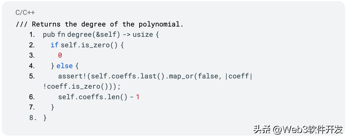 而且,在这段代码中,不只是在加法算法后缺乏多项式标准化。在加法运算前,self 和 other 作为 add() 函数的入参,也并没有检查他们是否是标准化的多项式表示。或者说,构造 self 和 other 的函数是否是按照标准化的方法进行构建的,也未可知。degree() 函数用来返回多项式的最高次项的指数。在 add() 函数中,非标准化的 self 和 other 在调用 degree() 函数时会引起 rust panic。