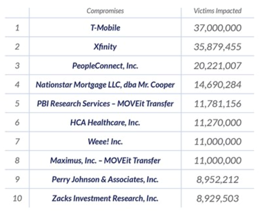 尽管ITRC报告的数据泄露数量大幅增加,但ITRC发现受泄露影响的受害者人数有所下降,降至353,027,892人,比2022年的425,212,090人下降了16%。这种下降属于长期趋势。与受害者人数最多的2018年相比,下降幅度高达84%。这表明攻击者正在更有针对性地采集目标的画像数据,以实施更加精准和复杂的攻击。