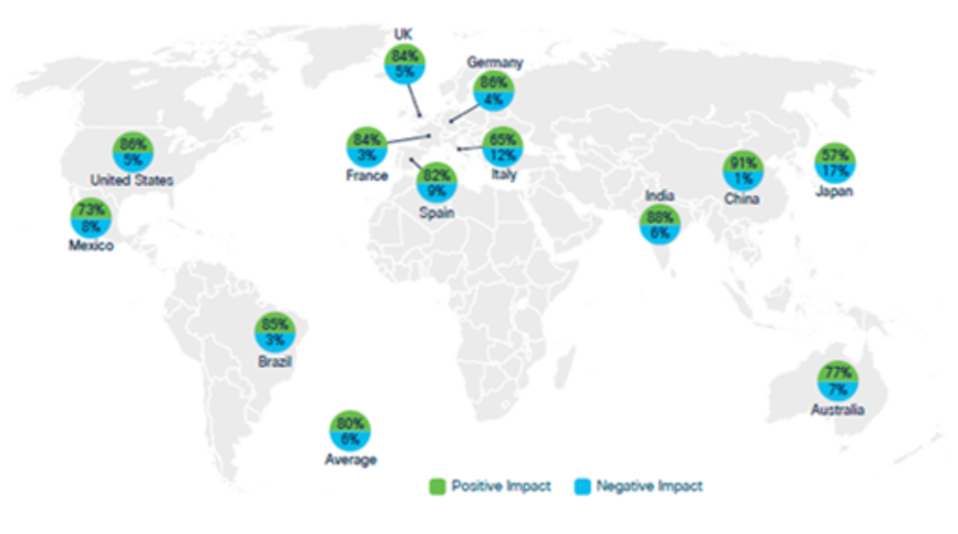 绝大多数受访者支持其政府实施数据隐私法,80%的受访者认为隐私法对其企业产生了积极影响,只有6%的人认为隐私法产生了负面影响。值得注意的是,中国的受访者对政府数据隐私法规的支持度最高,为91%(下图):