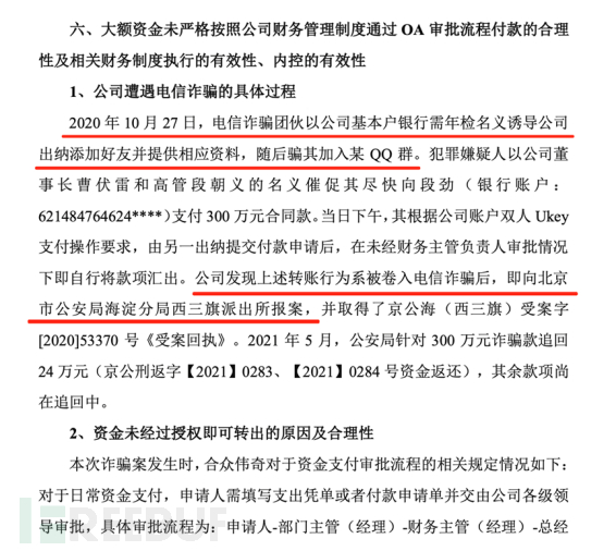 此外,还有多家拟上市公司披露的招股书显示,他们也曾遭遇过类似的诈骗。一家已经终止IPO的公司公告显示,该公司也曾遭遇BEC诈骗。此次事件就是一次经典的BEC攻击案例,攻击者通过“诱导财务人员加入QQ群”,将电子邮件伪造成银行官方邮箱,向企业财务人员批量投递“无害”的诱导信息,财务人员添加对方QQ后,被拉入了一个有“领导”的诈骗群,然后由攻击者扮演的“领导”命令“受害者”进行后续的转账汇款。此次事件导致公司银行账户内的300万元被盗取,随后公司向所在地公安机关报案并获受理。后续公安局针对300万元诈骗款追回24万元,款项返还至公司。
