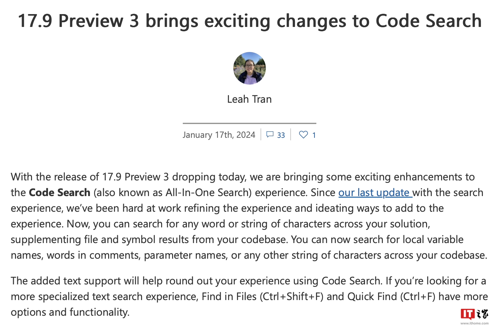 1 月 23 日消息,据微软官方新闻稿,微软目前推出了 Visual Studio 2022 17.9 Preview 3 版本,主要增强了内置的代码搜索能力,小伙伴们可点此下载。