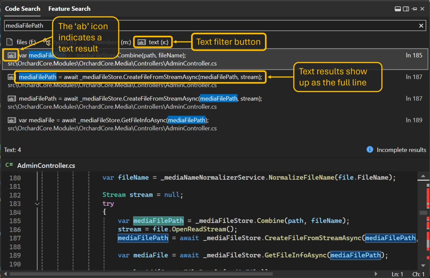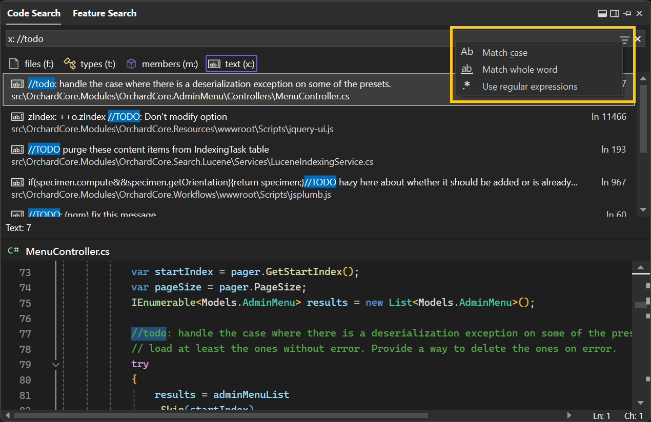 微软同时提到,原有的默认代码搜索功能(Ctrl+T 或 Ctrl+,)也将获得升级,用户可以得到“精确的文本匹配”,从而获得“以前未包括的注释和局部变量等项目的搜索结果”。