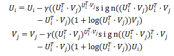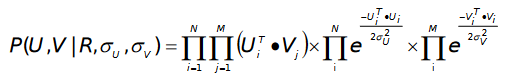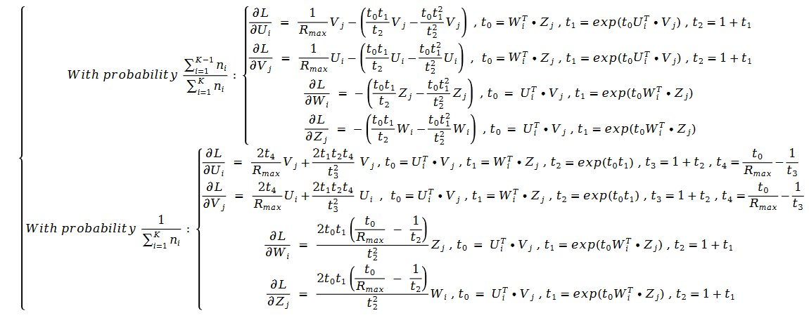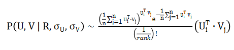 损失函数 L 可以通过随机梯度下降法进行求解。关于矩阵分解的最精确的数学解释是 2007 年的推荐系统里程碑论文 Probabilistic Matrix Factorization。这篇论文将矩阵分解重构成了最大似然函数求解问题。ZeroMat 将评分的高斯分布假设改成了真实的幂律分布,得到了如下的最大似然函数求解公式: