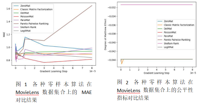 图 1 和图 2 展示的是 ZeroMat、DotMat、PoissonMat 和 LogitMat 与经典的矩阵分解模型的对比结果。可以看到,许多不需要任何数据的算法在准确性和公平性指标上都击败了经典的矩阵分解模型,而该模型利用了所有的用户评分矩阵数据。