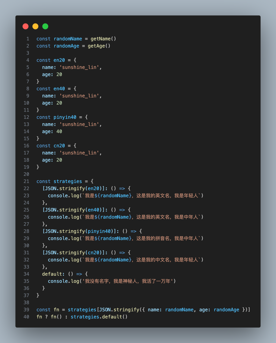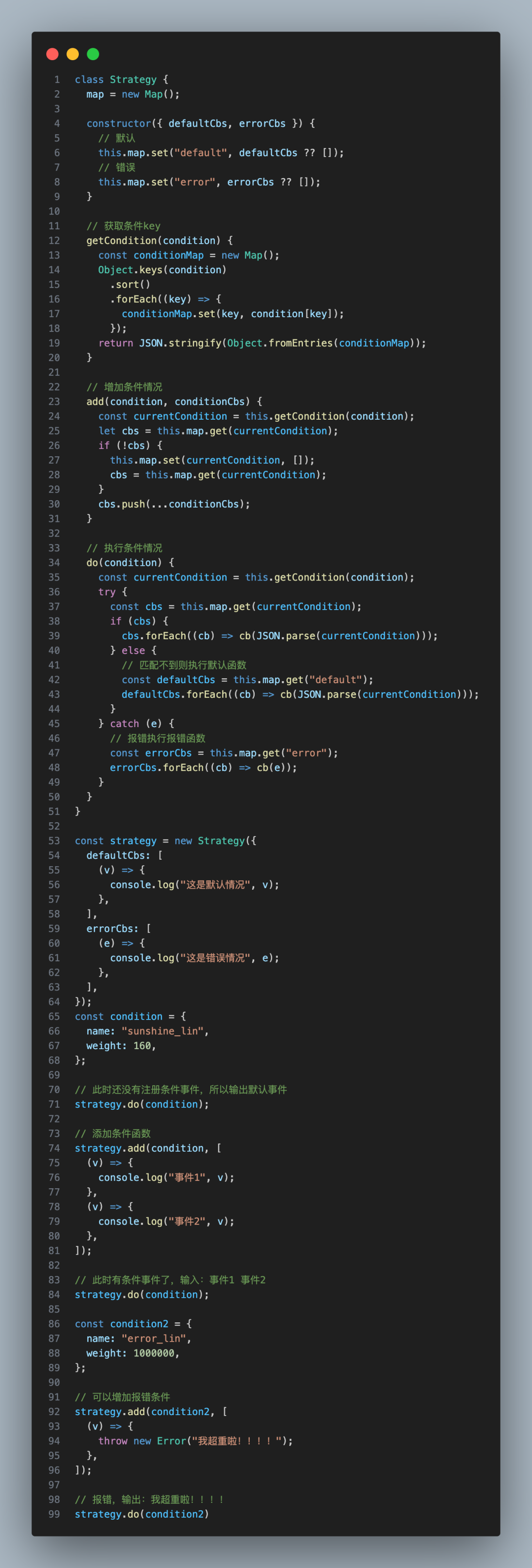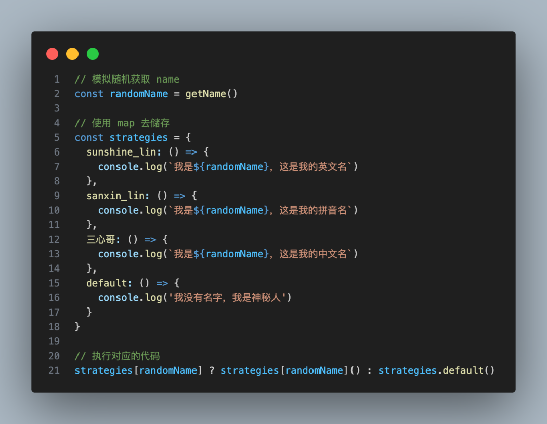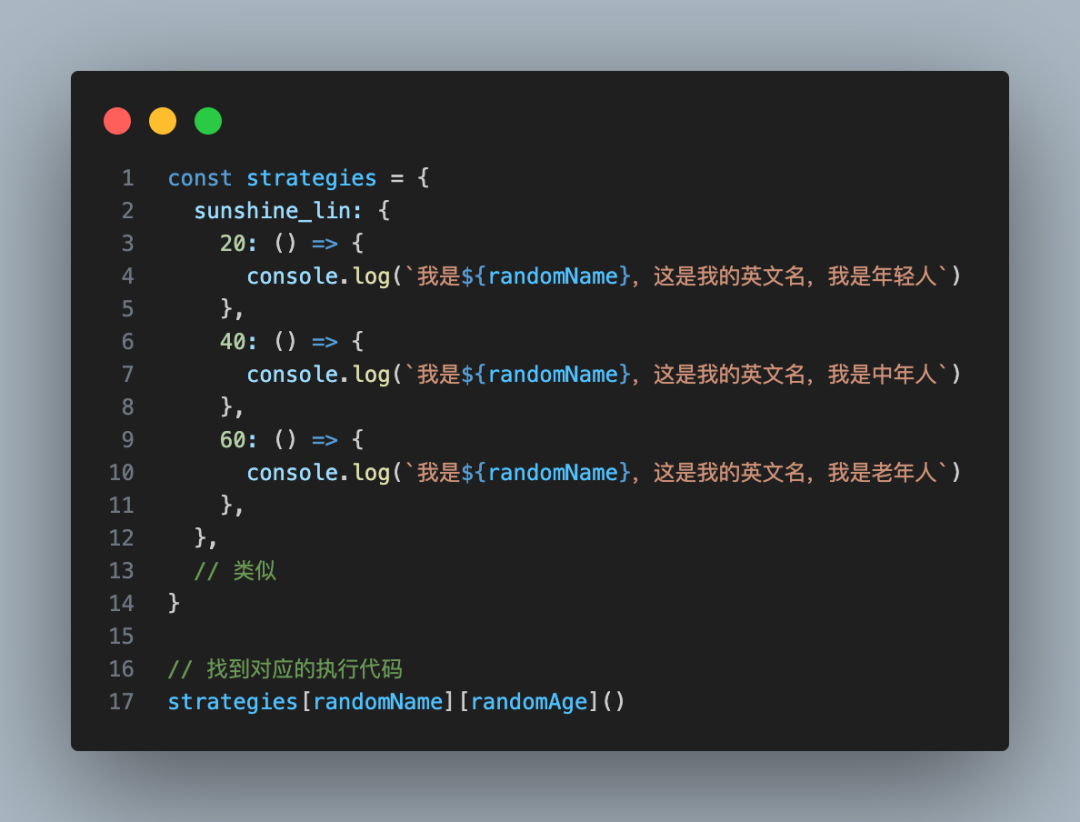 大方向上,还是用一个对象去映射,也就是不同条件映射到不同的执行代码,只不过呢,这个时候我们要把条件换一换,还是刚刚的例子: