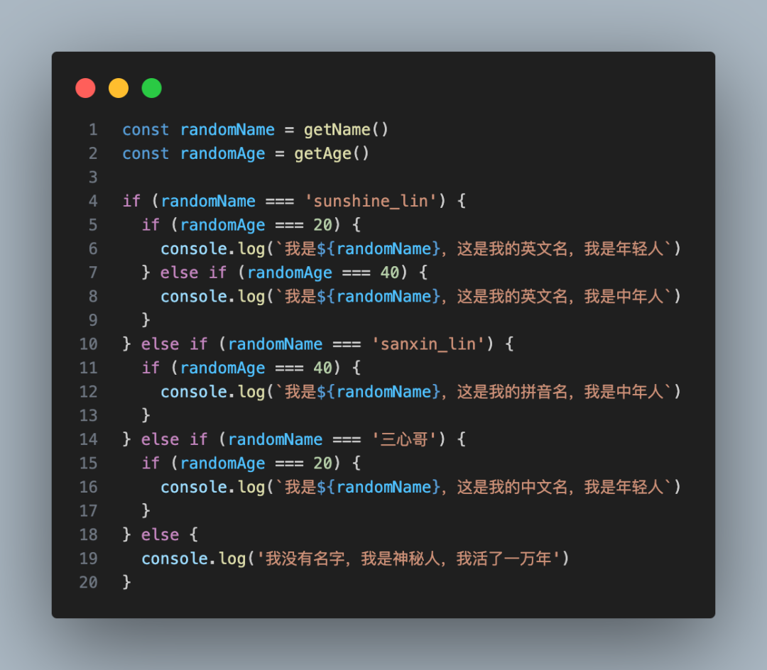 上面的代码例子是非常简单的,但是如果是一些比较复杂的场景呢?比如我不止 name 了,我加了 age ,那么这样的 if 嵌套,你又该如何去用简单的 map 去解决呢?