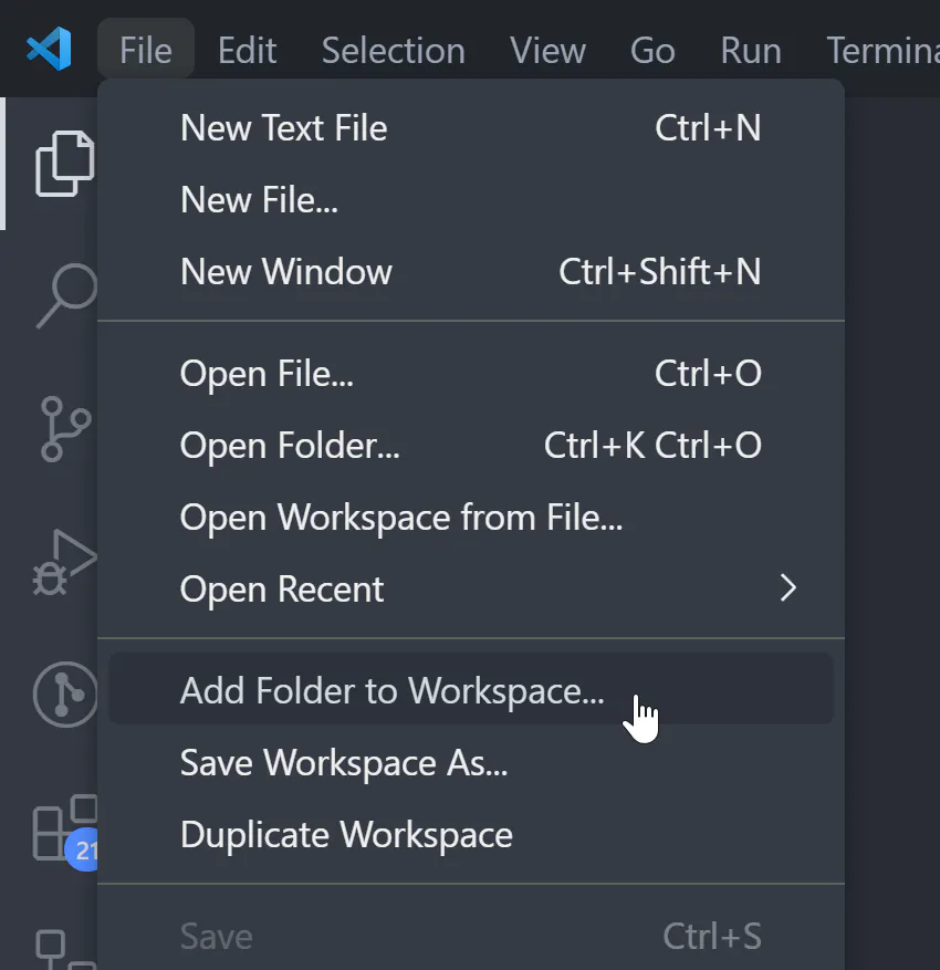 在 VS Code 中,每个文件夹都可以作为一个独立的工作区。可以通过使用“文件 > 向工作区添加文件夹...”菜单来很方便地为工作区添加更多文件夹。: