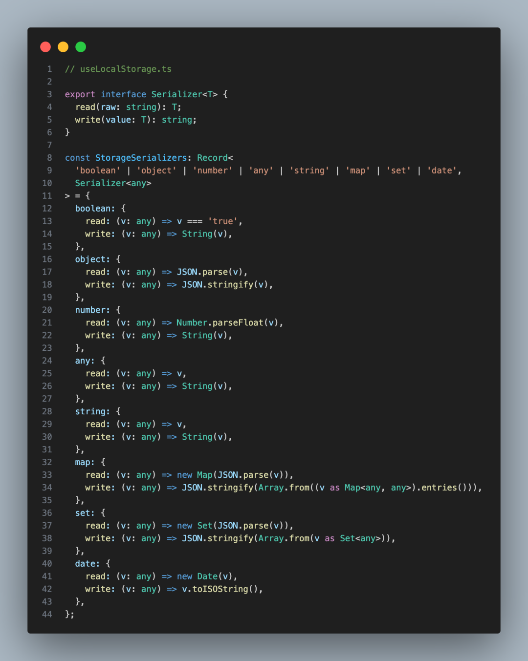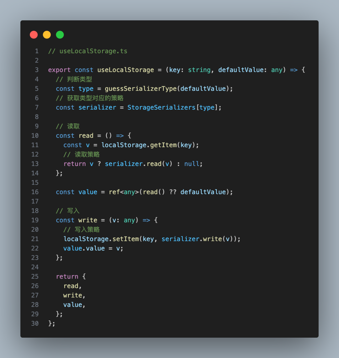 有的人就说了,可以把 JSON.parse、JSON.stringify 写在 useLocalStorage 中,但是这个方案只是针对 Object 而已,但是数据类型其实有多种:number、string、object、set、map、date 等等,你直接写在里面,不太合理,你得兼顾所有的数据类型才行!!