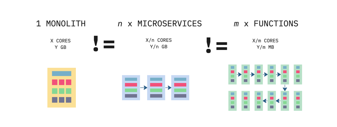 • 网络惩罚 — 与单体和微服务相比,每个函数调用现在都是一个网络跳跃,而不是作为进程内计算共同存在。