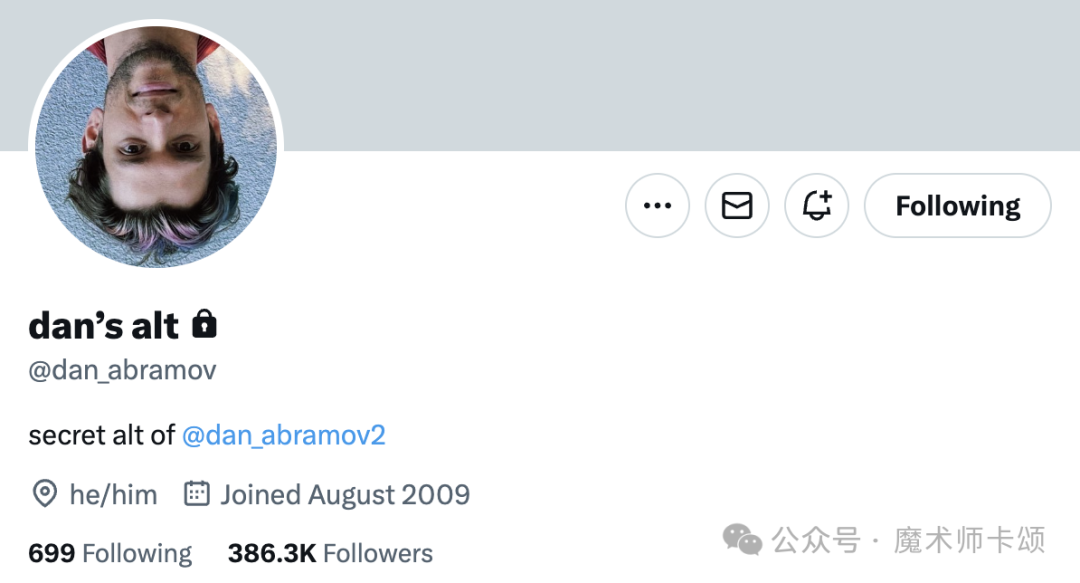 在RSC(React Server Component)特性发布后,Dan经常用这个账号科普各种RSC知识。这次封禁,显然对他的布道事业造成不小打击,不得已只能启用新账号。