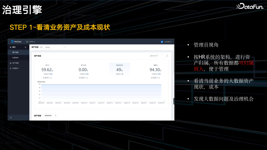 后面会介绍数据治理引擎,对所有资产不合理的地方进行抽象,得到一些治理项。这些治理项本身又是和资产分析挂钩的,如果资产项治理得好,资产分就会越来越高,如果长久不处理,那资产分可能会停止甚至会下降。通过资产分,管理者更易定KPI,也方便执行。