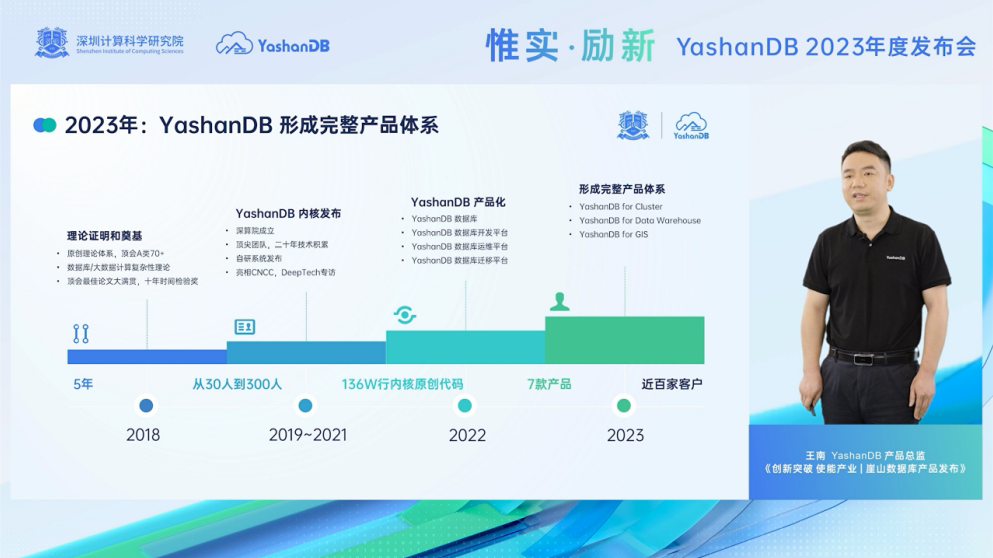 11月8日,深圳计算科学研究院(简称:深算院)自主设计研发的国产新型数据库系统YashanDB 2023年度产品发布会成功召开,崖山数据库系统共享集群、空间数据库以及实时数仓三款新品及五大行业级解决方案全新亮相。此次YashanDB多项原创突破性技术与创新商用性产品的重磅推出,将打造国产数据库系统在金融核心、智慧城市等关键行业广泛落地应用的示范和标杆。
