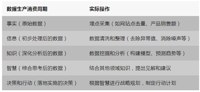 假设某电商公司的决策者需要决定是否继续推广一款新产品。他可以收集关于该产品的销售数据(事实)、分析该产品的销售趋势和潜在需求(信息)、评估竞争对手的情况和行业动态(知识),同时结合这些数据对未来市场的走势做出预测(智慧)。最后,基于这些洞察,决策者可以选择合适的推广策略,并采取相应行动来实现预期目标。 现在,让我们通过一张图来表示这一过程:数据生产消费周期实际操作