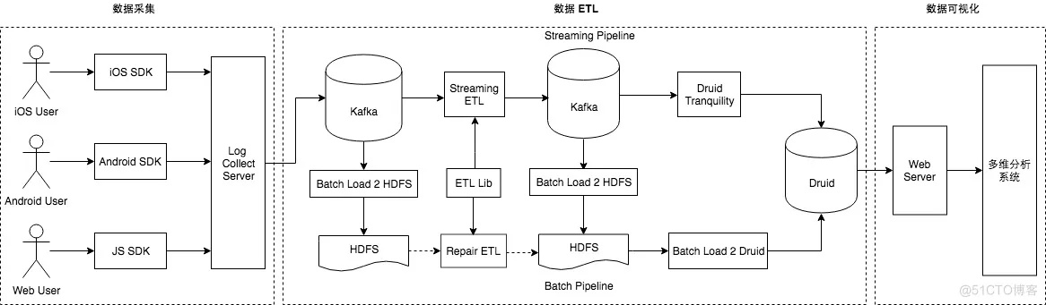 第一部分是数据采集,由三端 SDK 采集数据并通过 Log Collector Server 发送到 Kafka。第二部分是数据 ETL,主要完成对原始数据的清洗和加工并分实时和离线导入 Druid。第三部分是数据可视化,由 Druid 负责计算指标并通过 Web Server 配合前端完成数据可视化。