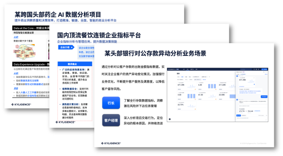 甘甜在演讲中介绍,Kyligence 携手某头部跨国药企打造了精准、敏捷、全面、智能的商业分析平台,以 AI + 指标平台这一全新的形式满足业务部门复杂多样的分析需求,提高了商业洞察的质量和决策效率;Kyligence 助力合作多年的国内顶流餐饮连锁企业升级了指标平台,结合最新的生成式 AI 技术,在一线人员范围推广并使用 AI 数智助理,进一步降低业务人员使用数据的门槛;基于服务多年金融客户的经验和结合 AI 的智能一站式指标平台,Kyligence 服务头部银行创新分析对公存款大额异动、绩效分析、贷款业务管理等场景,让银行分支行也能享受数智化转型的最新成果,真正将 AI 用起来。
