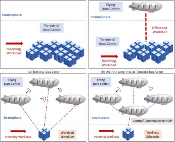 今年9月一份题为“数据中心支持的高空平台:绿色计算替代方案”的报告,评估了高空平台(HAP)的潜在能源效益,高空平台是一种概念性的数据中心系统,服务器安装在充满氦气的、飞艇状的飞艇。