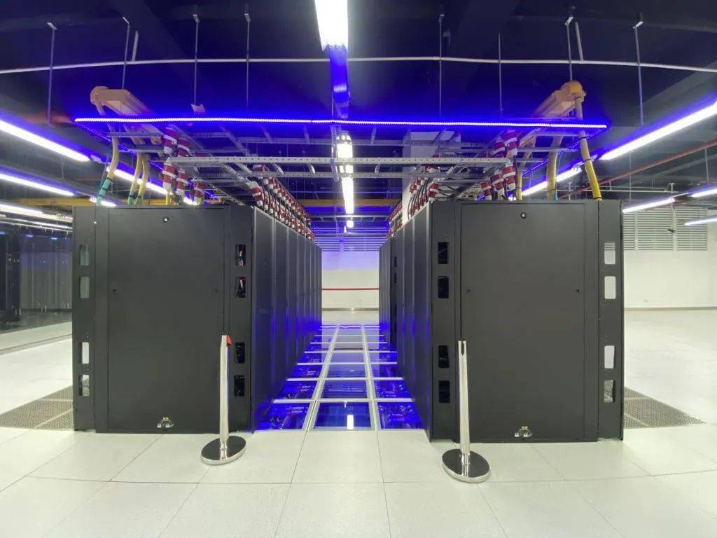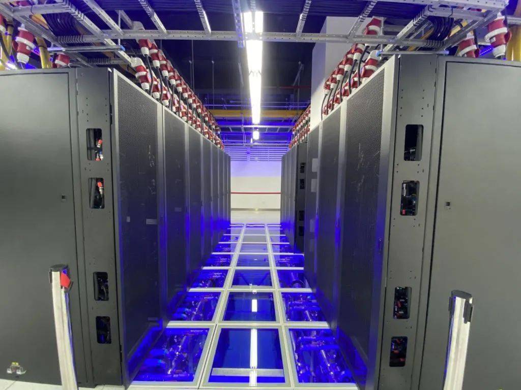 吉利星睿智算中心·智能仿真平台单机柜功率高达70KW,采用冷板式液冷散热。透过玻璃地板,可以清晰看到复杂、有序的水冷管道。