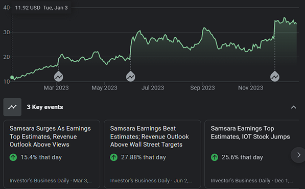 Samsara 2023年股票表现和盈利新闻(图片来源:Google search of Samsara stock, 1Y view)