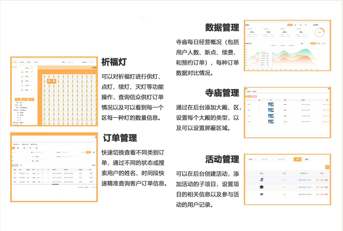 建设分为智能硬件和互联网平台两大部分,可为寺庙及信众提供现场和远程供灯、寻灯、照片回传等智能供灯服务。传统宗教文化与智能科技创新结合的新科技产品,助力宗教文化传播,让信众和寺庙“手相连,心更近”。