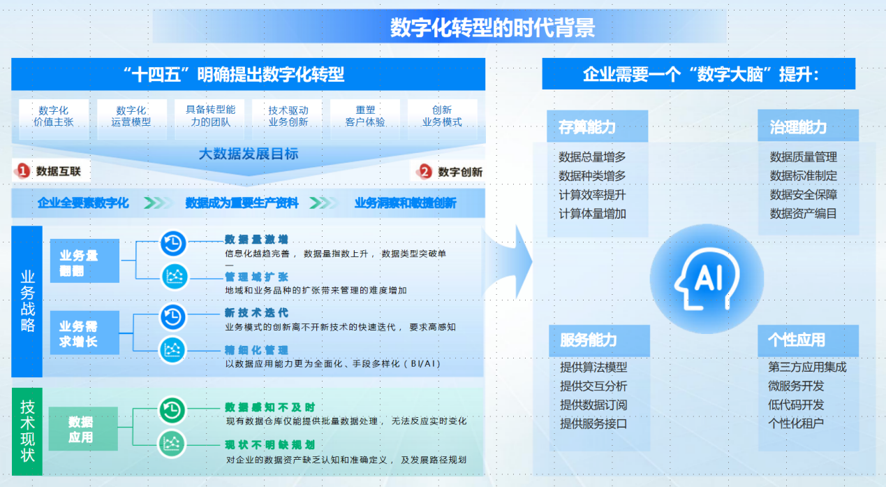 而企业的数字化转型需要一个“数字大脑”的提升,包括存算能力、治理能力、服务能力、个性应用。