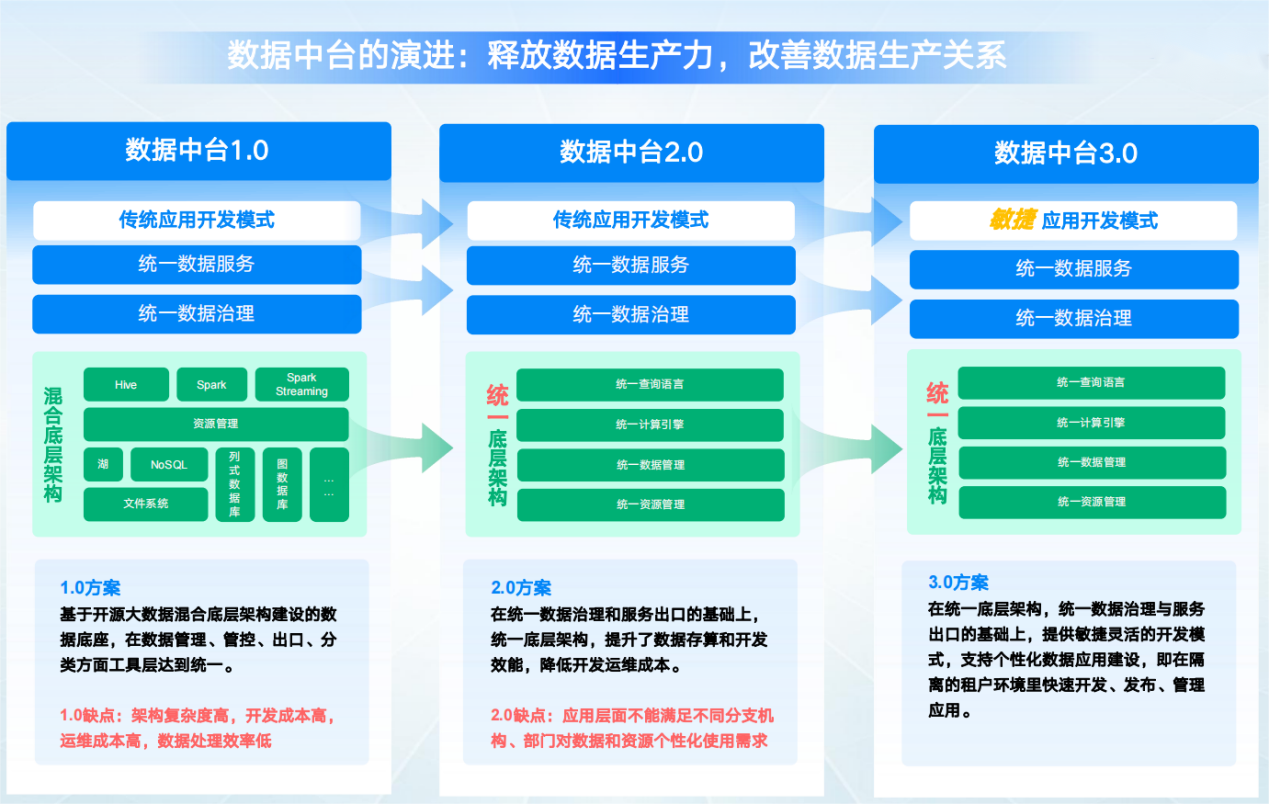 因此,数据中台的建设一般会历经3个版本的演进之路,从而实现“释放数据生产力,改善数据生产关系”的目标。