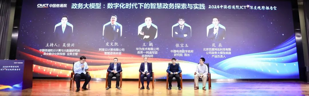 大会同时邀请了产业各方嘉宾发表精彩演讲和圆桌对话。在嘉宾主题演讲环节,中国联合网络通信集团有限公司数字化部总监杜宇发表《数字化转型的关键要素、关键能力--中国联通数字化转型实践情况》主题演讲;昆仑数智科技有限责任公司昆仑ERP业务部技术经理刘晓龙发表《中国石油昆仑ERP的信创实践之路》主题演讲;华为云计算技术有限公司产业发展总监王鑫发表《央国企信创实践分享》主题演讲。在圆桌对话环节,中国信通院云计算与大数据研究所政企数字化转型部业务主管吴佳兴主持圆桌对话《政务大模型:数字化时代下的智慧政务探索与实践》,邀请中国电信数字政府研究院院长张宝玉、华为技术有限公司政务一网通军团总架构师王鹏、阿里云计算有限公司智能咨询总监皮文凯和北京百度网讯科技有限公司政务大模型底座产品负责人苑辰分别就政务大模型在各类场景的优先应用、地区政务大模型建设未来应用和部署趋势等议题进行了深入探讨。