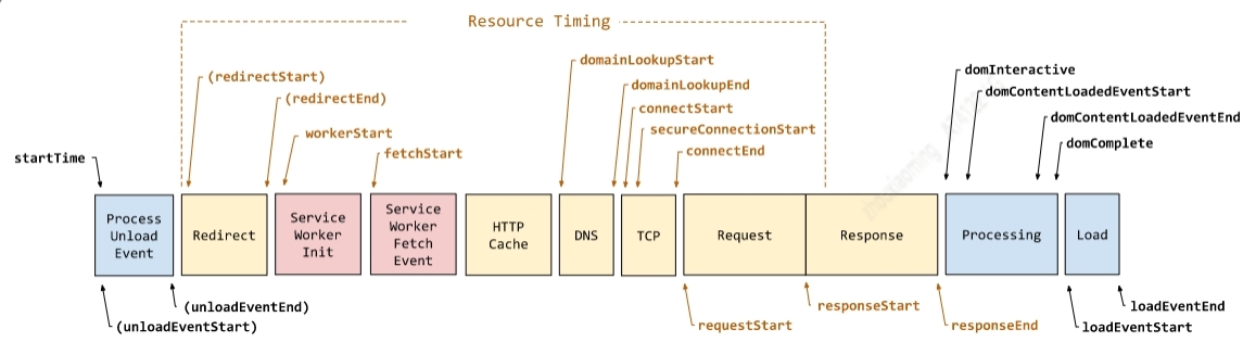 PerformanceNavigationTiming ( 以下简称 Timing ): 基于 W3C 规范,着重从浏览器处理过程角度衡量页面性能,以下简称 Timing。