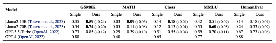 例如,在 GSM8K 任务上提升了 12% 至 24%,在 MATH 上提升了 6% 至 10%。有趣的是,多个小 LLM 集成可以达到甚至超越较大 LLM 的性能。例如,多个 Llama2-13B 的集成在 GSM8K 上达到了 59% 准确率,超过了单一 Llama2-70B 的 54% 的准确率。