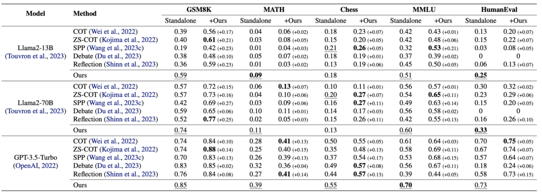 论文从 Llama2 和 GPT 系列选择不同规模的语言模型进行评估,任务数据集涵盖推理和生成等多个领域。实验结果表明,在所有任务和不同种类、规模的 LLM 上,发现 LLM 的性能随着实例化 agent 的数量而增加。
