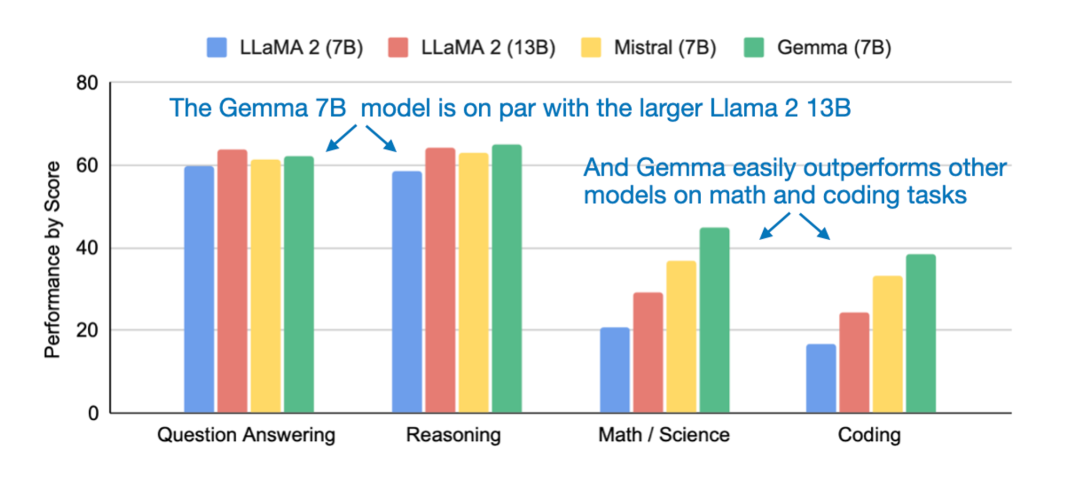 谷歌发布了包含两种权重规模的模型:Gemma 2B 和 Gemma 7B。尽管体量较小,但 Gemma 已经「在关键基准测试中明显超越了更大的模型」,包括 Llama-2 7B 和 13B,以及风头正劲的 Mistral 7B。与此同时,关于 Gemma 的技术报告也一并放出。