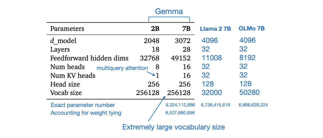 Raschka 猜测 Gemma 7B 实际上总共有 93 亿个参数,如果考虑到权重共享(Weight tying)的话,则有 85 亿个参数。权重共享意味着模型在输入嵌入和输出投影层中共享相同的权重,类似于 GPT-2 和 OLMo 1B(OLMO 7B 的训练没有权重共享)。