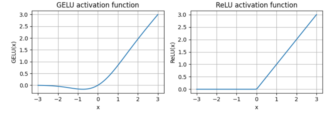 GeLU 与 ReLU 激活函数图示比较,来源:https://github.com/rasbt/LLMs-from-scratch