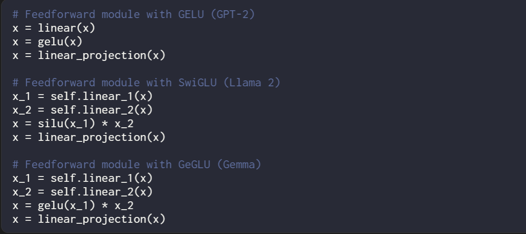 下图展示了 GeLU(GPT-2)、SwiGLU(Llama 2)和 GeGLU(Gemma)的伪代码。