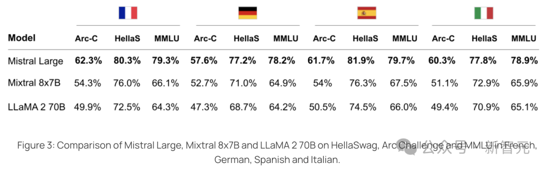 作为一款欧洲人自己的大模型,Mistral Large在法语、德语、西班牙语和意大利语上的表现,均优于Llama 2 70B模型。