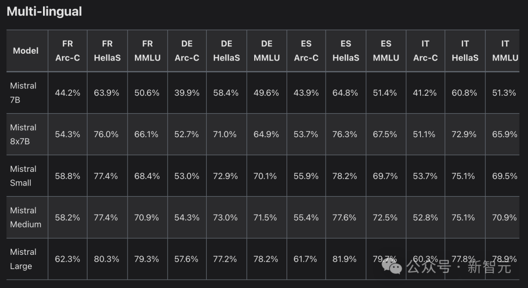 - Mistral Large能够母语般流利地使用英语、法语、西班牙语、德语和意大利语,深刻理解各自的语法规则和文化背景。