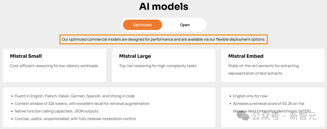 - 提供竞争力价格的开放权重端点,包括open-mistral-7B和open-mixtral-8x7b。