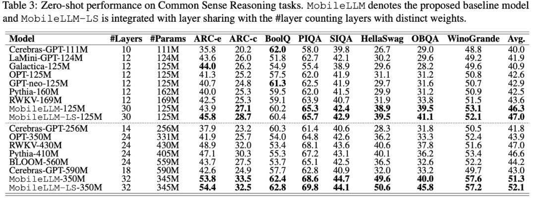 基于深而窄的架构,加上嵌入共享和分组查询注意力机制,Meta 建立了一个强大的基线网络,称为 MobileLLM,与之前的 125M/350M 最先进模型相比,其准确率显著提高了 2.7%/4.3% 。这也说明了与缩放定律(scaling law)相反,该研究证明对于小型 LLM 来说深度比宽度更重要,一个深而窄的模型结构在捕获抽象概念方面更为出色。