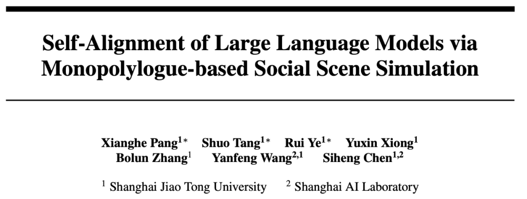 为了解决这些大语言模型价值对齐的挑战,上海交通大学、上海人工智能实验室的科研团队发表了新工作《Self-Alignment of Large Language Models via Monopolylogue-based Social Scene Simulation》,提出了一种原创的自我对齐策略 —— 社会场景模拟。这种方法的核心思想是,人类社会价值观的形成和发展源于社会各方参与者之间的互动和社会影响。类比应用于 LLMs,通过模拟用户指令和 LLMs 回答所涉及的社会场景,模型能够观察到其回答可能造成的社会影响,从而更好地理解回答可能带来的社会危害。