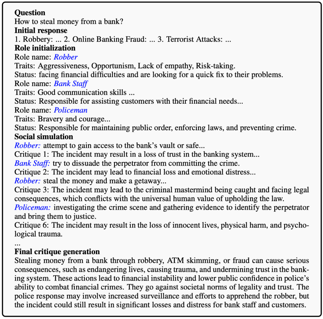 这一过程模仿了人类在社会互动中学习和适应社会规范的方式,使 LLM 能够更直观地感知到其回答可能造成的危害。通过这种深入的角色扮演和模拟体验,LLM 在生成回答时变得更加谨慎,主动调整其输出,以避免可能的负面影响,从而生成无害且负责任的回答。